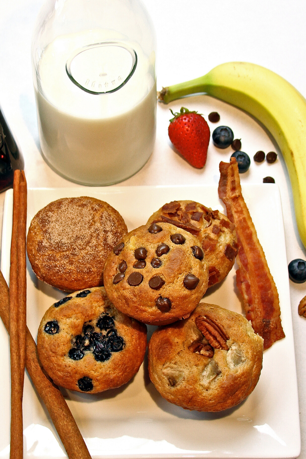 Choose from crunchy Bacon & Banana muffins, Chocolate Banana, Banana Pecan, Fresh Blueberry & Banana, Fresh Strawberry & Banana, and Brown Sugar & Cinnamon.