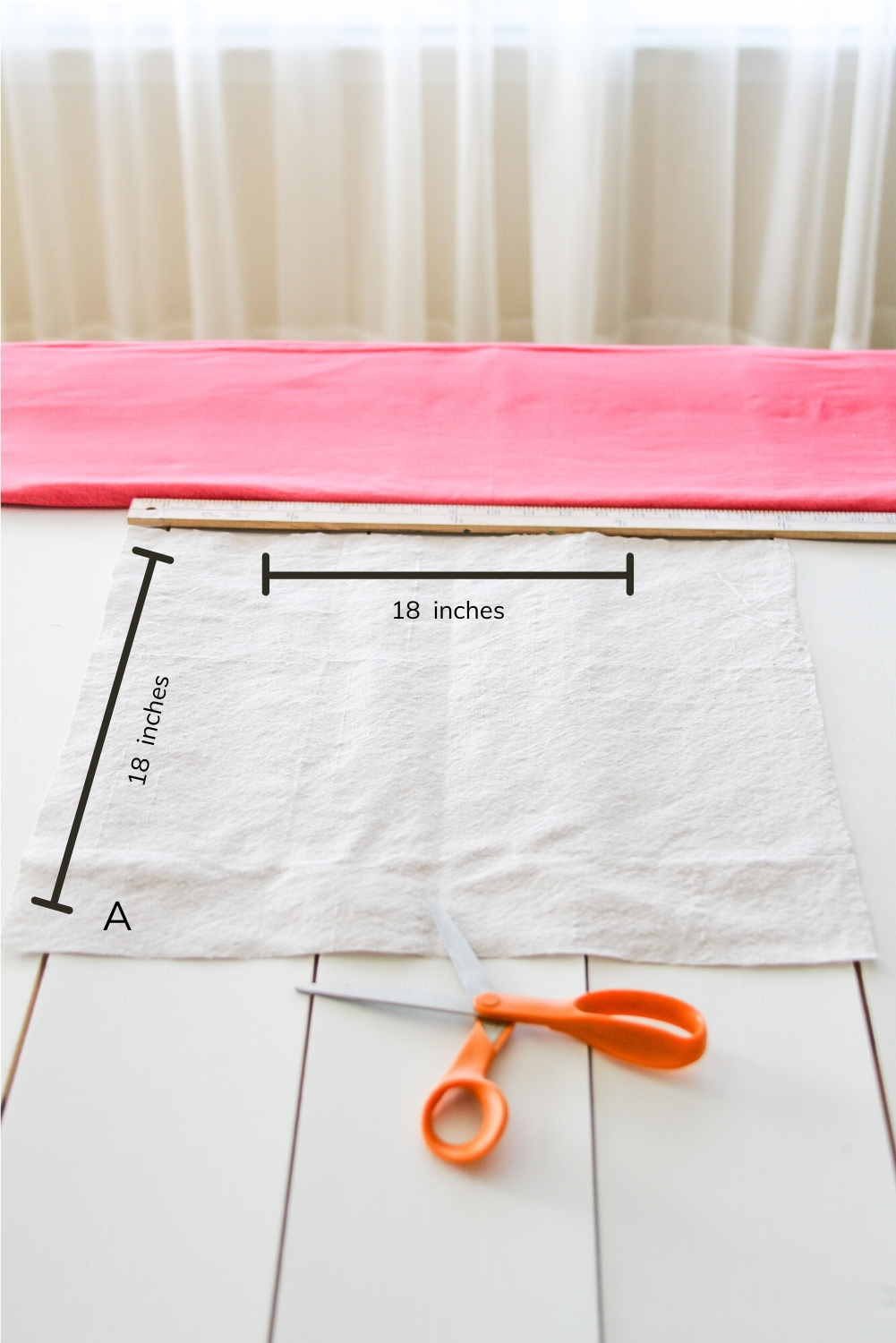 Now that the fabric is washed and dried cut out one 18 X 18-inch piece of fabric. This piece is the front of the pillow cover labeled “A. “