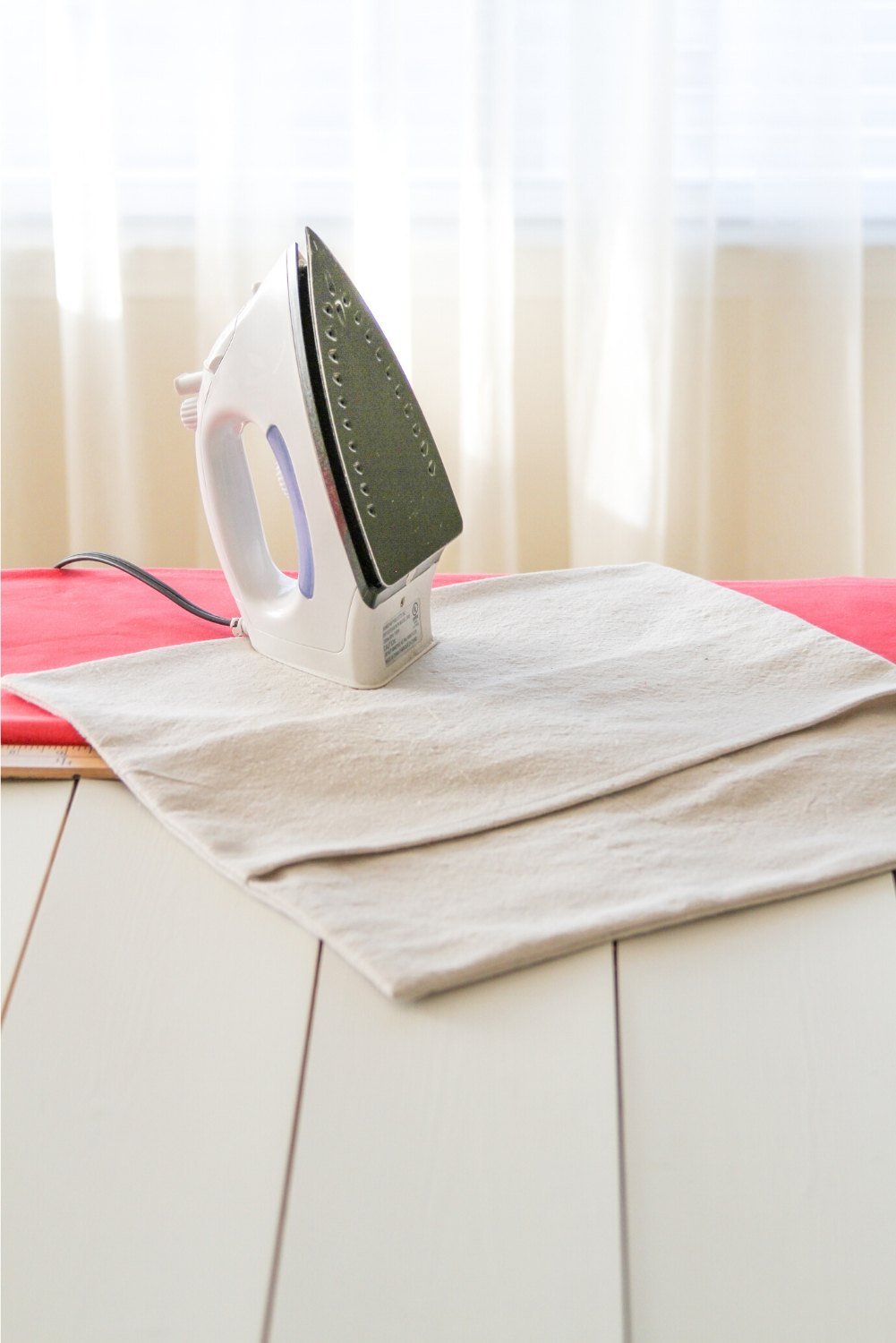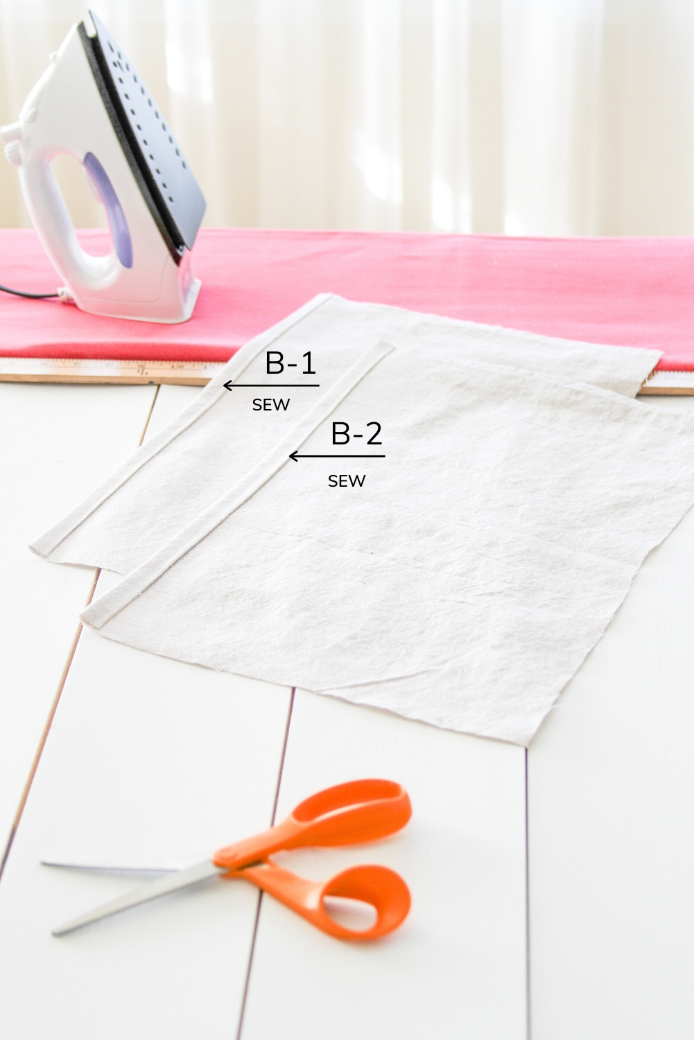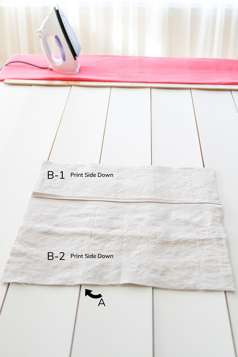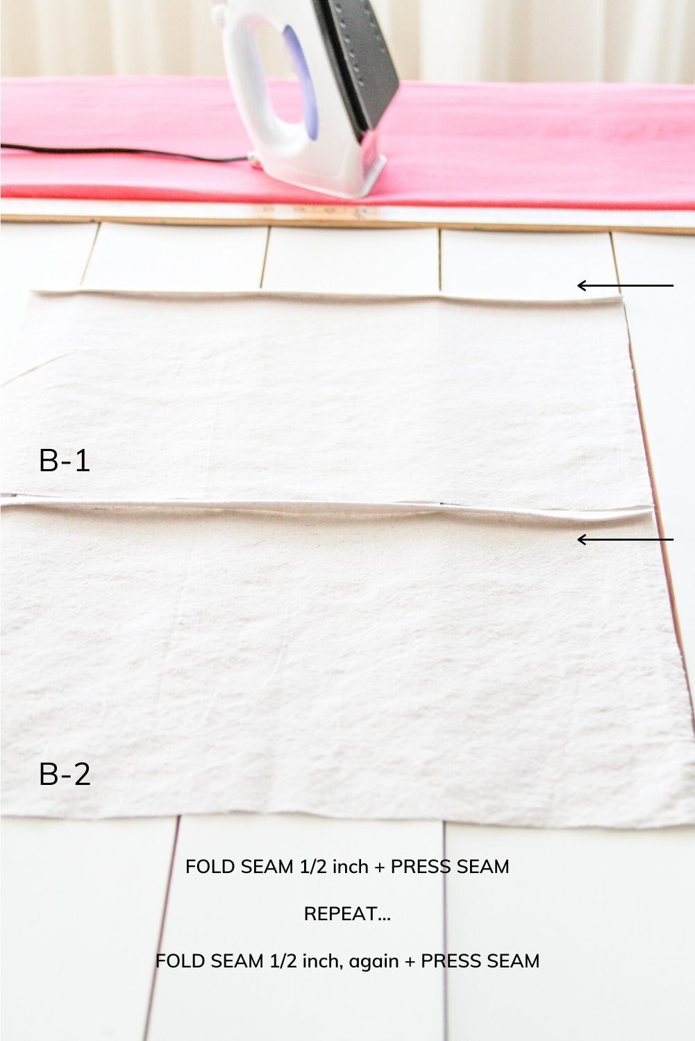 If you have a print to your fabric, ensure that the print side is facing down. For B1 and B2, fold the top edge of the seam down a 1/2 inch, then press with a warm iron.