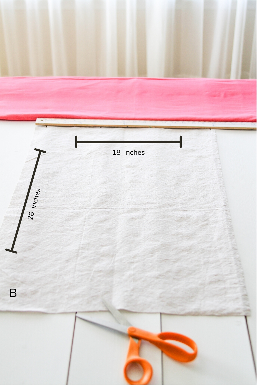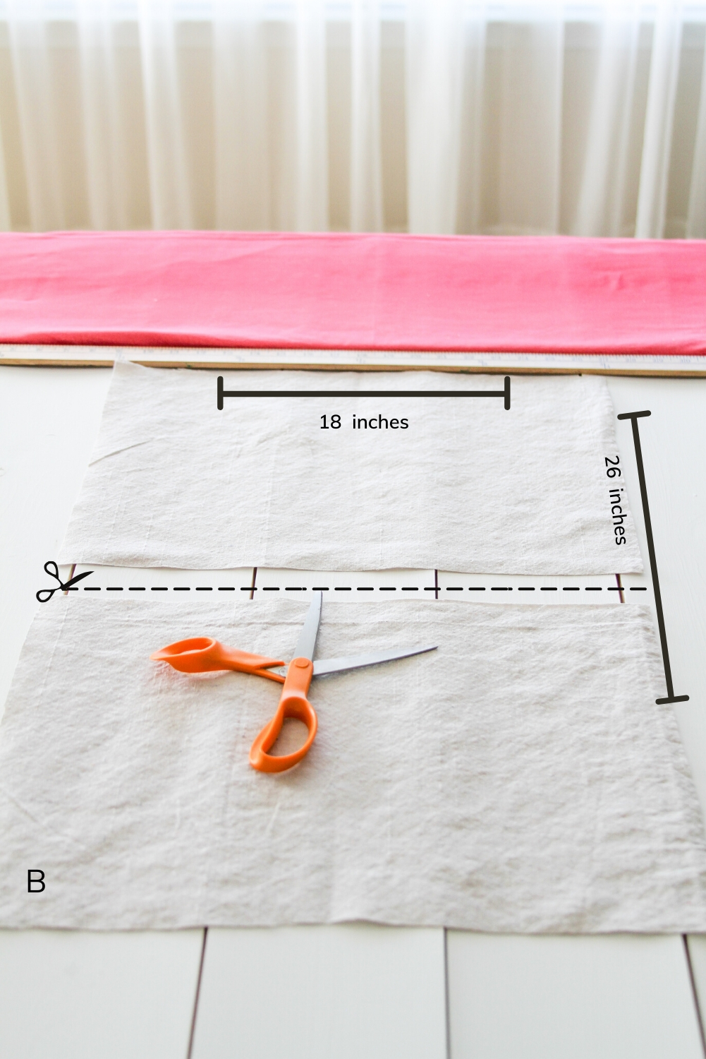 Now, Cut out one 18 X 26-inch piece of fabric. This piece is the back of the envelope pillow cover labeled “B. “