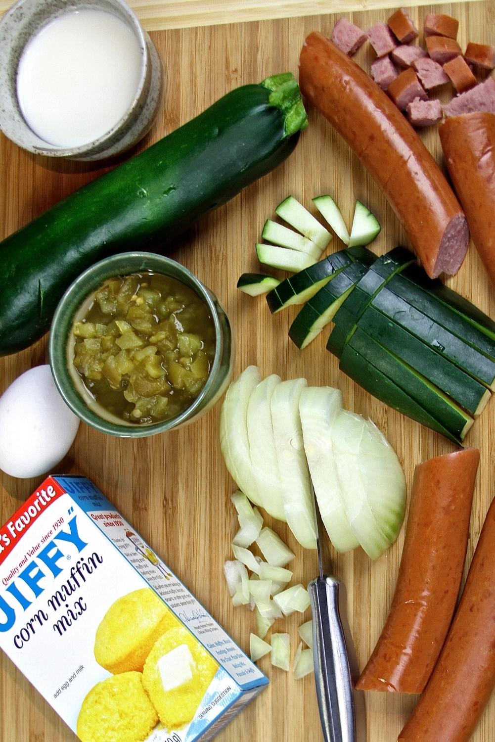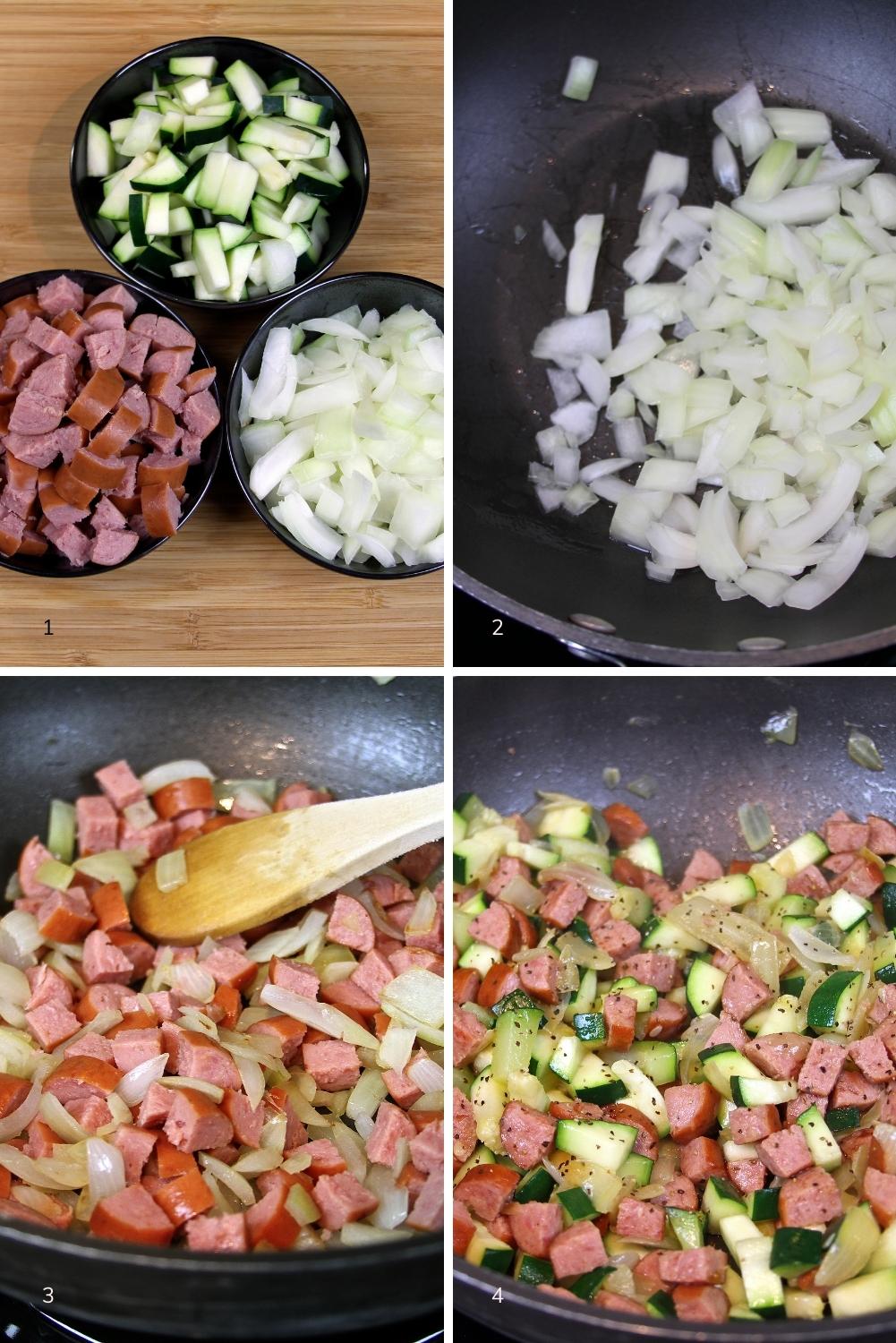 - Gather all of the ingredients. Dice or chop sausage, zucchini, and onions.